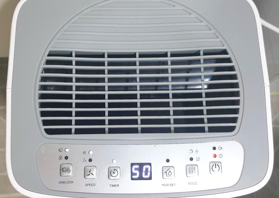 기능은 왼쪽부터 공기정화기능, 잠금 / 세기 / 타이머 / 습도상세조절, 온도표시 / 취침모드 / 전원 순으로 되어있다.